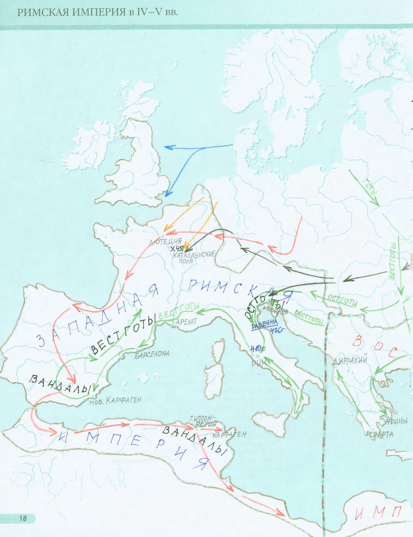 6. Стрелками зелёного цвета нанесите основные направления вторжений готских племён (готов, вестготов, остготов).
