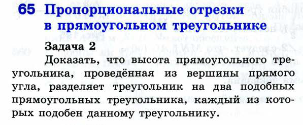 Высота прямоугольного треугольника, проведённая из вершины прямого угла, разделяет треугольник на подобные треугольники.