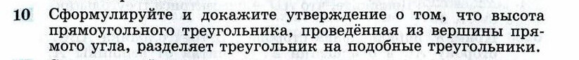 Сформулируйте и докажите утверждение о том, что высота прямоугольного треугольника, проведённая из вершины прямого угла, разделяет треугольник на подобные треугольники.