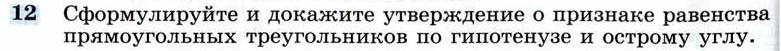 Вопрос 12: Сформулируйте и докажите утверждение о признаке равенства прямоугольных треугольников по гипотенузе и острому углу.