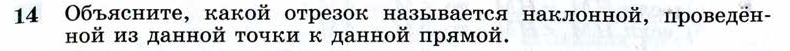 Вопрос 14: Объясните, какой отрезок называется наклонной, проведённой из данной точки к данной прямой. Ответ: Отрезок, проведенный из точки к прямой, называется наклонной, если этот отрезок отличен от перпендикуляра.