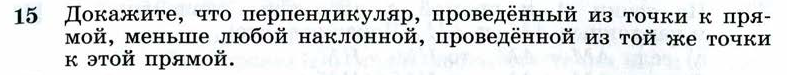 Вопрос 15: Докажите, что перпендикуляр, проведённый из точки к прямой, меньше любой наклонной, проведённой из той же точки к этой прямой. Ответ: