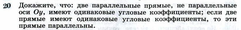 Докажите, что: две параллельные прямые, не параллельные оси, имеют одинаковые угловые коэффициенты; если две прямые имеют одинаковые угловые коэффициенты, то эти прямые параллельны.