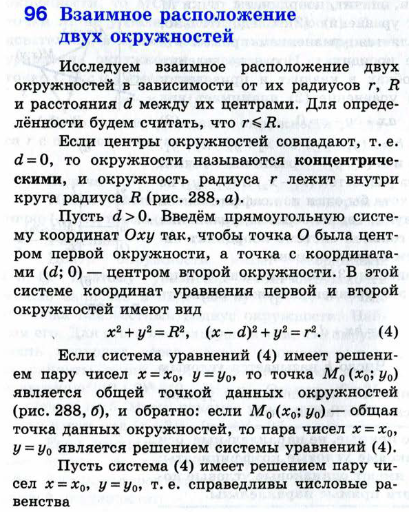 Взаимное расположение двух окружностей в зависимости от их радиусов и расстояния между их центрами