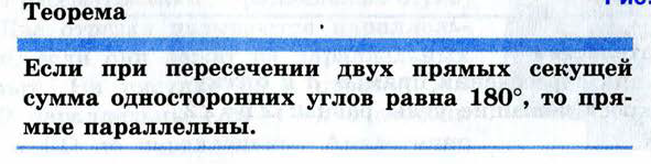 Докажите, что если при пересечении двух прямых секущей сумма односторонних углов равна 180°, то прямые параллельны.