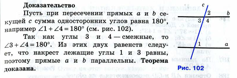 Вопрос 5: Докажите, что если при пересечении двух прямых секущей сумма односторонних углов равна 180°, то прямые параллельны.